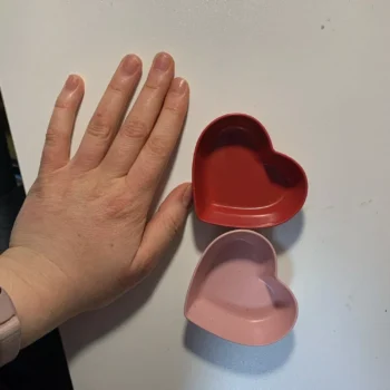 The cutest plate! Very comfortable, stable, roomy (M & M's 45g bag will mix perfectly), I think I will order a couple of different things!! These little heart bowls are so pretty. My cats eat fancy feast and they are the right size for a serving of food, my cats get fed 4-5 times a day, I just stick them in dishwasher and they come completely clean and i use sanitizer rinse cycle..