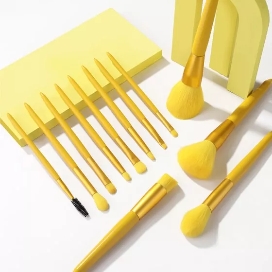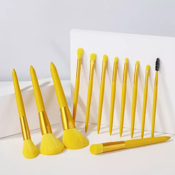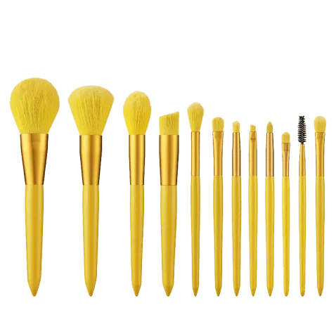 This set of brushes is amazing. Bright yellow color exactly as the name says. 12 brushes for an amazing price. Combination of face and eye brushes help with a whole look. Set includes individual packaged brushes, care instructions and the type of each brush and its uses. They are soft but dense. Great addition to my collection.